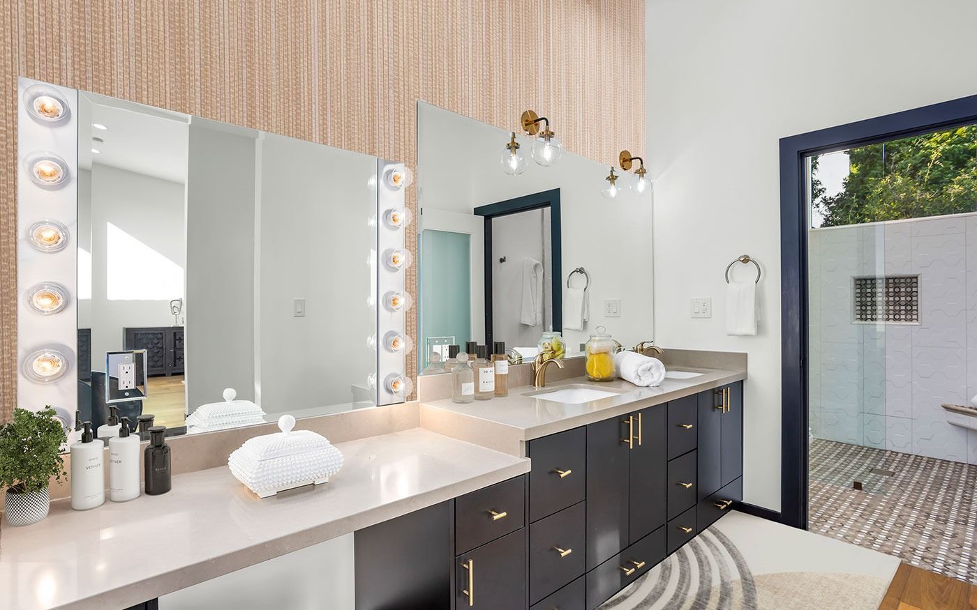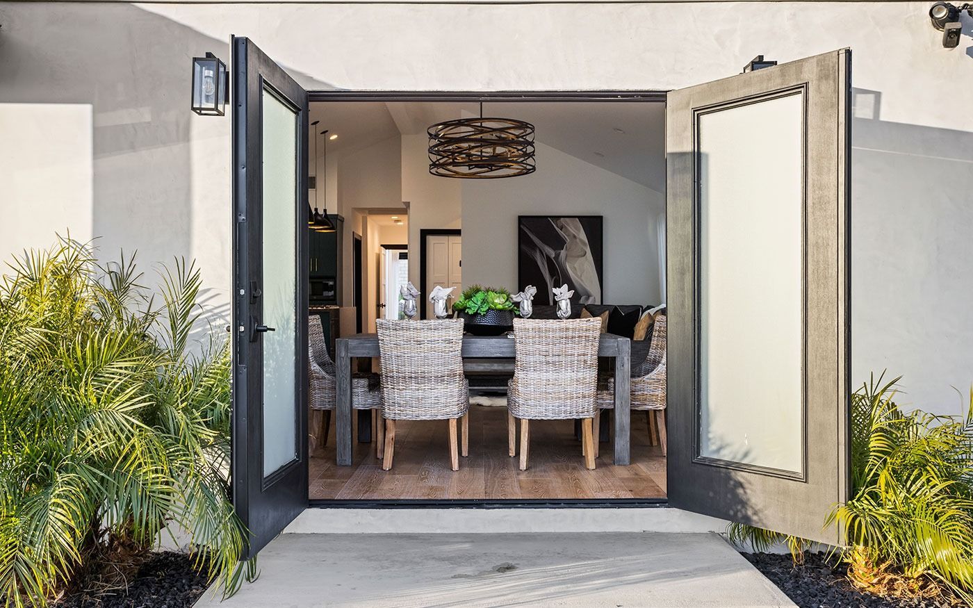 The client purchased this 1951 time capsule and wanted to gut it and extend the footprint. We opened the entire existing living space creating an entertaining space and added a full primary suite complete with its own atrium. They were adamant we go bold, so we appointed a peacock teal for the kitchen cabinets, grounding them with a rich wood grain quartz with waterfall edge on the island and white quartz counters along the perimeter. The clients have thrown lots of parties in their new space, and they tell everyone to look for the MidMod bungalow with the Gumby green door.