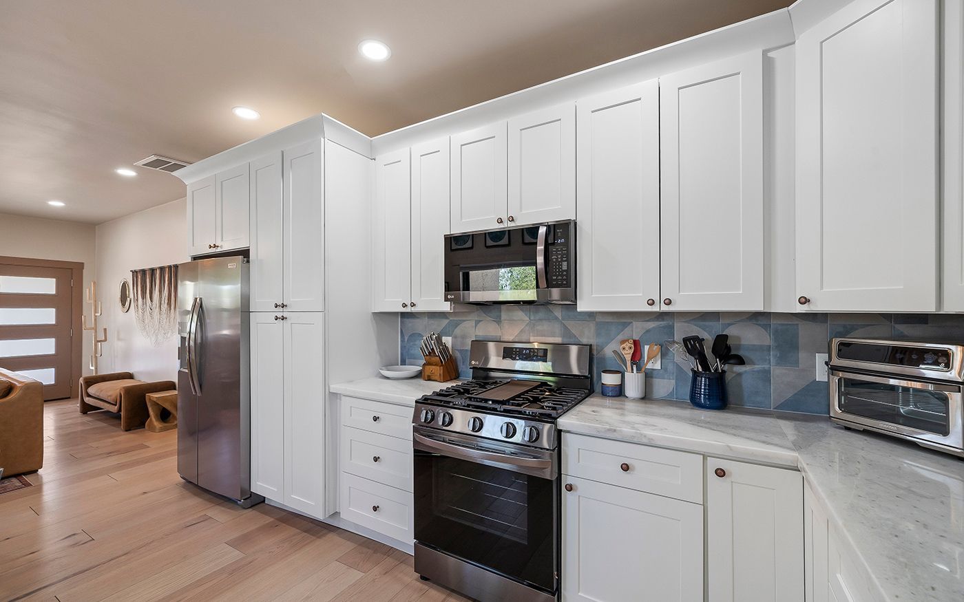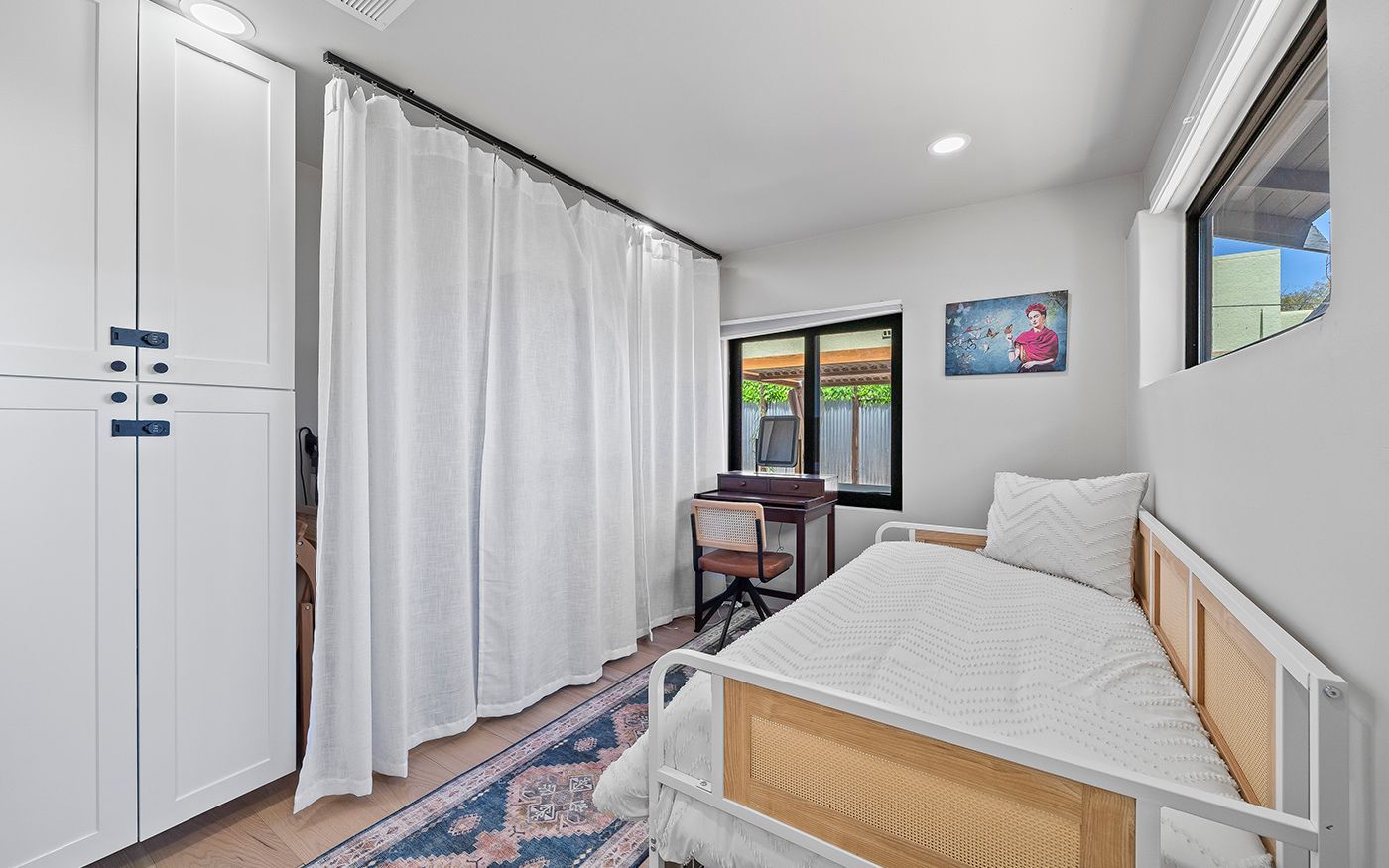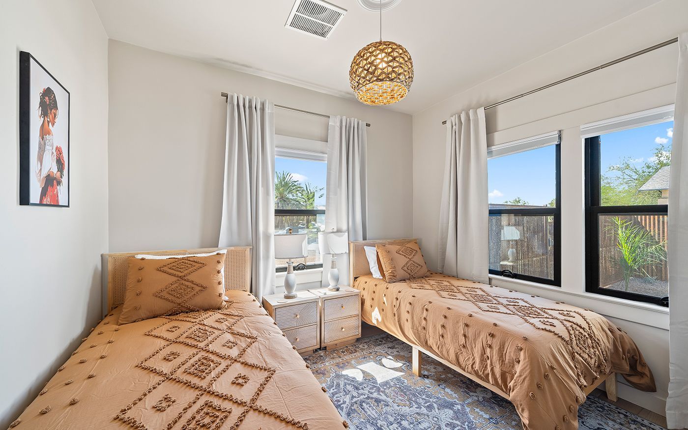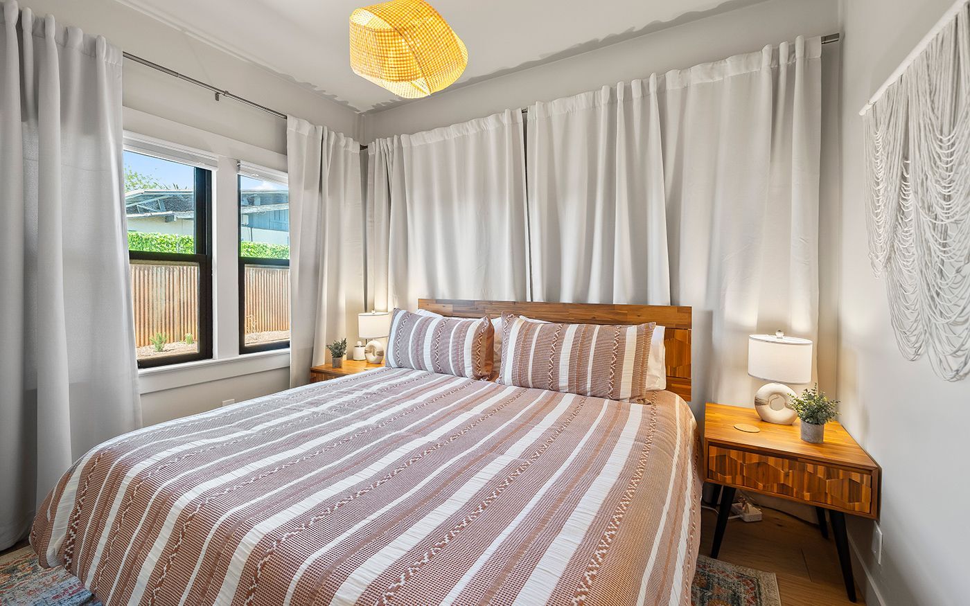 We transformed this once drab gray house into a vibrant, Southwestern-inspired Airbnb-ready retreat. By infusing it with character, color, and style, we gave the home a whole new identity. We also reimagined the oversized laundry room, converting it into a functional third bedroom—turning this 2-bedroom home into a spacious 3-bedroom getaway.